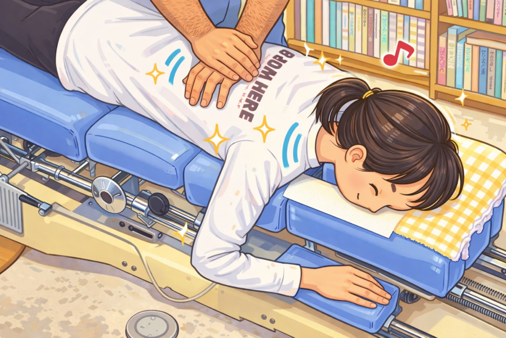 Japanese chiropractic clinic illustration, friendly anime style, detailed background